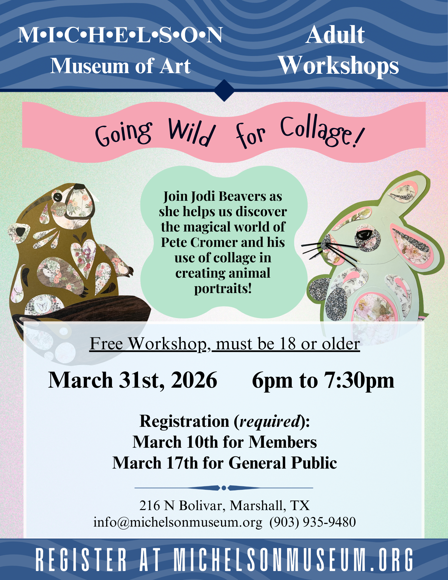 Join us for this magical workshop as we learn about artist Pete Cromer and his whimsical world of collage animals! Jodi Beavers will show us a variety of techniques and skills that can be used to make your very own cute and fun animal portrait.