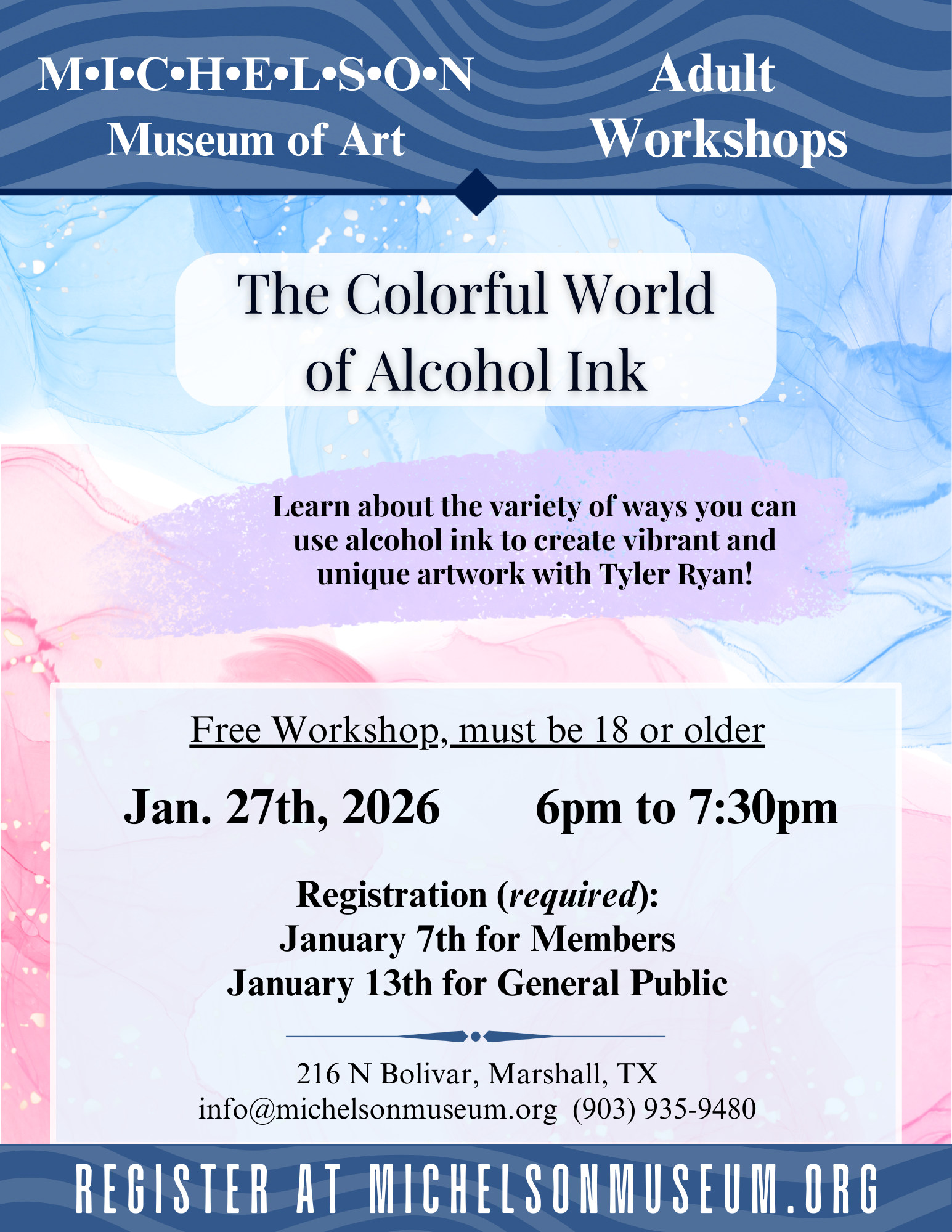 Join us for this fun workshop and learn about the variety of ways you can use alcohol ink to create vibrant and unique works of art! Tyler Ryan will cover the basics of using this medium, including color lenses, blooming effects, and how to make the most of your tools.